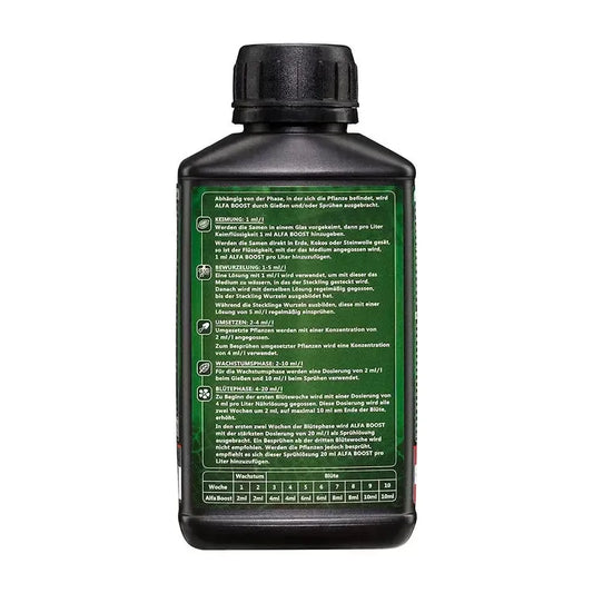 Natürliche Pflanzenkraft für maximale Erträge Mit Alfa Boost erhältst du ein 100 % organisches Pflanzenhilfsmittel, das Wachstum, Gesundheit und Ernteertrag deiner Pflanzen spürbar verbessert – ganz ohne synthetische Zusätze oder Gentechnik. Die in Österreich hergestellte Rezeptur basiert auf fermentierten Biokräutern, lebenden Mikroorganismen sowie pflanzenaktiven Wirkstoffen, die dein Bodenleben aktivieren und deine Pflanzen von der Wurzel bis zur Frucht stärken. Spürbar mehr Ertrag – ganz natürlich Alfa Boost beschleunigt die Keimung, fördert das Wurzelwachstum und bringt deine Pflanzen schneller durch die Wachstums- und Blütephase. Die Folge: schnellere Reife, kräftigeres Wachstum und ein deutlich höherer Ertrag. Perfekt für Stecklinge, Keimlinge oder die Blütephase anspruchsvoller Pflanzen. Gesunde Wurzeln, gesunder Boden Durch die enthaltenen Bakterien- und Pilzkulturen werden abgestorbene Wurzelreste in nützliche Enzyme, Vitamine und Antioxidantien umgewandelt – das schafft ein regeneratives Bodenmilieu, verhindert Fäulnis und beugt Versalzungen vor. Alfa Boost stärkt die gesamte Pflanze und macht sie weniger anfällig für Krankheiten und Umwelteinflüsse.Normaler Preis ab 14,19 €Normaler PreisGrundpreis 56,76 € pro lVerkaufspreis ab 14,19 €inkl. MwSt. zzgl. Versand -