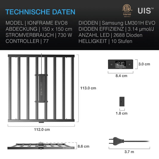High-End LED-Growlampe für professionelle Indoor-Grows Die AC Infinity IONFRAME EVO8 ist eine leistungsstarke Vollspektrum-LED für große Growzelte und Growräume. Sie wurde speziell entwickelt, um Wachstumsgeschwindigkeit, Pflanzengesundheit und Erträge auf Flächen bis 150×150 cm deutlich zu steigern – ideal für ambitionierte Homegrower und professionelle Anwendungen. Perfekte Lichtverteilung durch innovativen Bar-Formfaktor Der stabförmige Aufbau mit offenem Rahmen verteilt das Licht gleichmäßig über die gesamte Anbaufläche. Algorithmisch angeordnete Dioden reduzieren Hotspots und sorgen für eine intensive, gleichmäßige Durchdringung des Blätterdachs – selbst bei dichter Bepflanzung. Vollspektrum mit UV, Deep Red & Far Red Ausgestattet mit Samsung LM301H EVO LEDs liefert die EVO8 höchste Effizienz und Lichtqualität. Ergänzt wird das Spektrum durch 395 nm UV, 660 nm OSRAM Deep Red und 730 nm Far Red, um Photosynthese, Blütenentwicklung und Pflanzenstruktur optimal zu unterstützen. Intelligente Steuerung & modulares Wärmemanagement Die integrierte Steuerung bietet 10 Dimmstufen, Zeitpläne sowie eine realistische Sonnenauf- und -untergangssimulation. Über die UIS-Plattform lässt sich die EVO8 mit Controllern wie dem CONTROLLER 69 PRO vollständig automatisieren. Der abnehmbare, passiv gekühlte Treiber kann außerhalb des Zeltes montiert werden und reduziert effektiv die Wärmebelastung im Growraum.Normaler Preis 989,90 €Normaler PreisGrundpreis proVerkaufspreis 989,90 €inkl. MwSt. zzgl. Versand -
